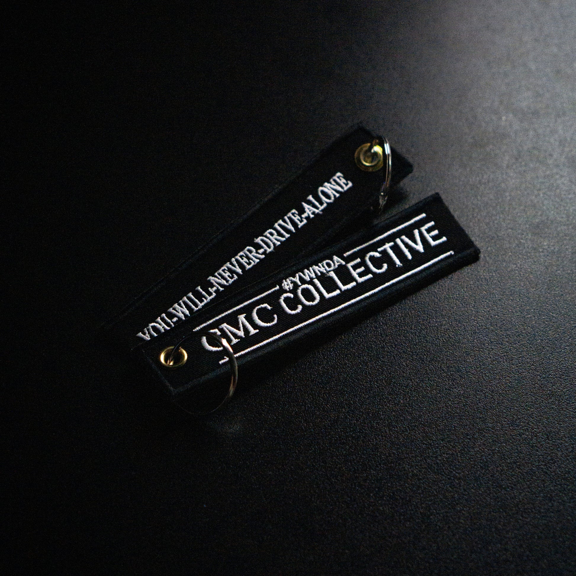 Embroidered flight tag keyring featuring CMC COLLECTIVE on one side and YOU WILL NEVER DRIVE ALONE on the other.